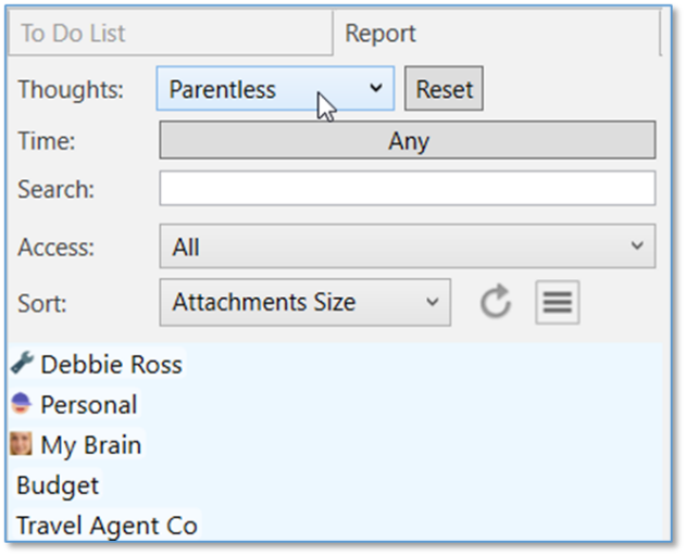 Select Parentless in the Thoughts drop-down to quickly view and access any thoughts that do not have a parent.
