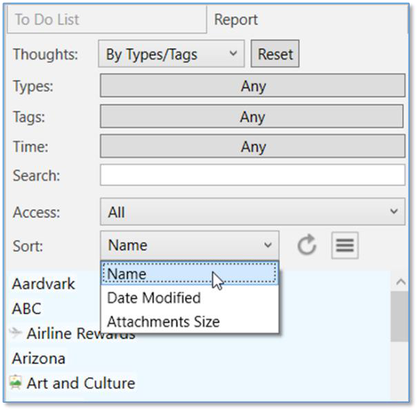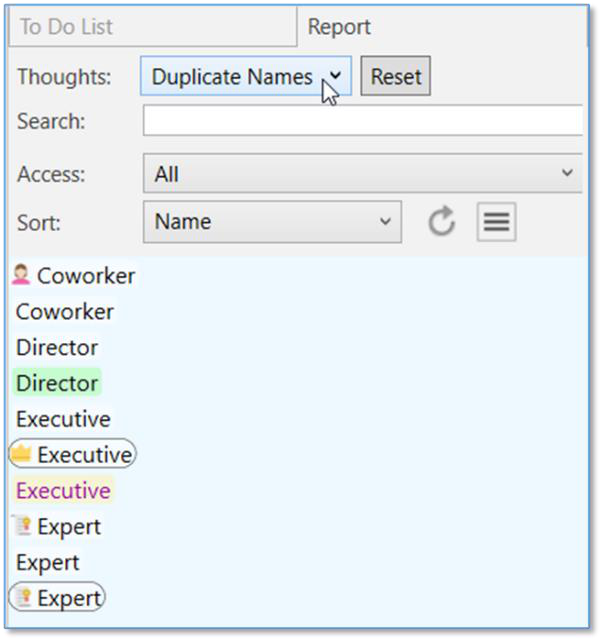 Select Duplicate Names in the Thoughts drop-down to quickly view and access multiple thoughts with the same name.