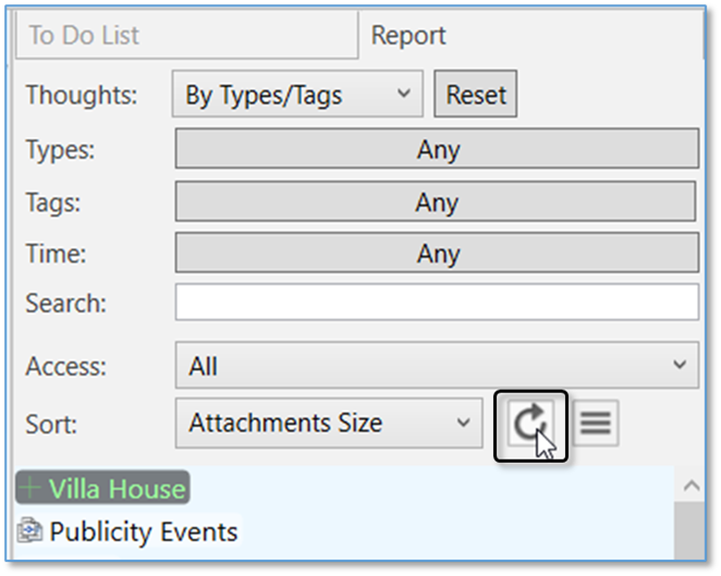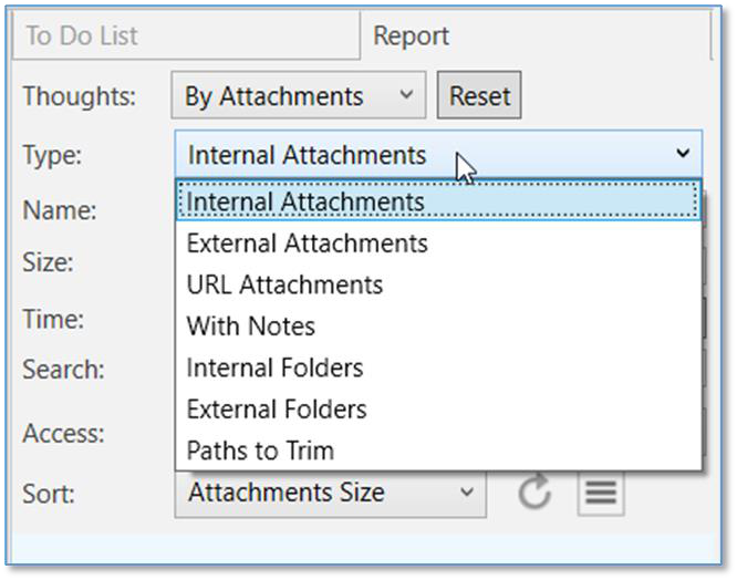 Select By Attachments in the Thoughts drop-down to quickly view and access all thoughts that have an attachment. By default, only internal attachments will be included and you can use the Type drop-down list to fine-tune as needed.