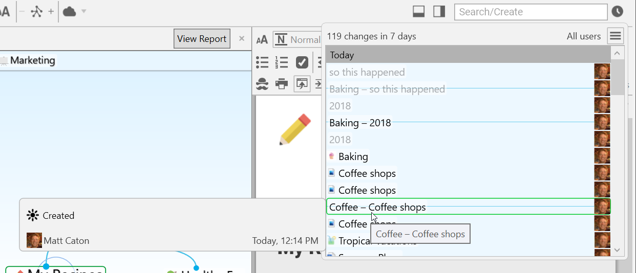 To view your recently modified thoughts, simply click on the clock icon to the right of the Search box. Modified thoughts will be displayed starting with the current date. When you hover over a thought, a comprehensive, time-stamped report of the exact modification(s) appear in a pop-up next to the name.