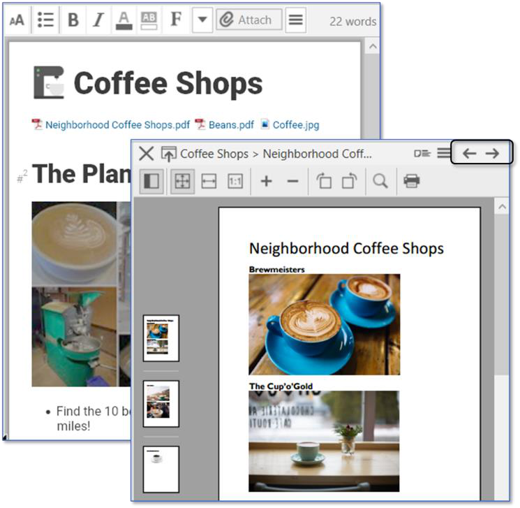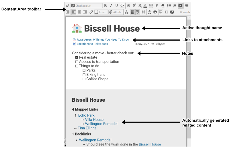 The content area keeps all of your thought-specific notes and attachments. Attachments can be files, web pages, pictures, and more.