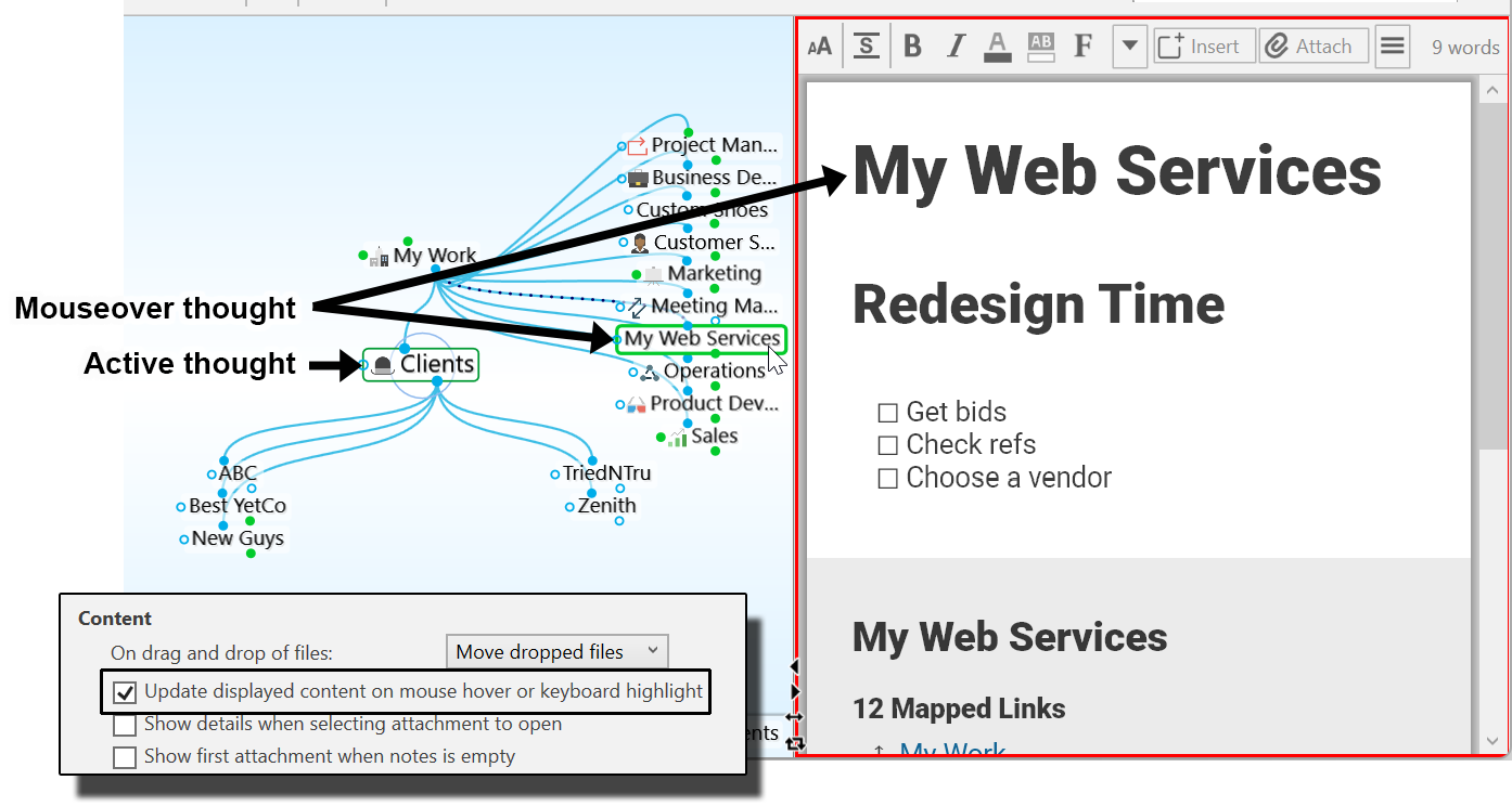 - A red border highlights the content area when the content belongs to a moused-over thought.