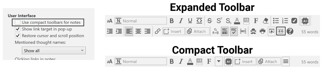 To show the expanded toolbar even if the content area isnât very wide, deselect the âUse compact toolbars for Notesâ check box in the