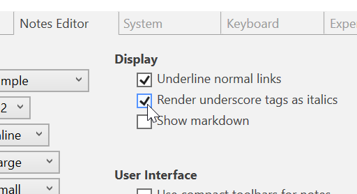 Checking the option for Render underscore tags as italics will change the word to be italicized.