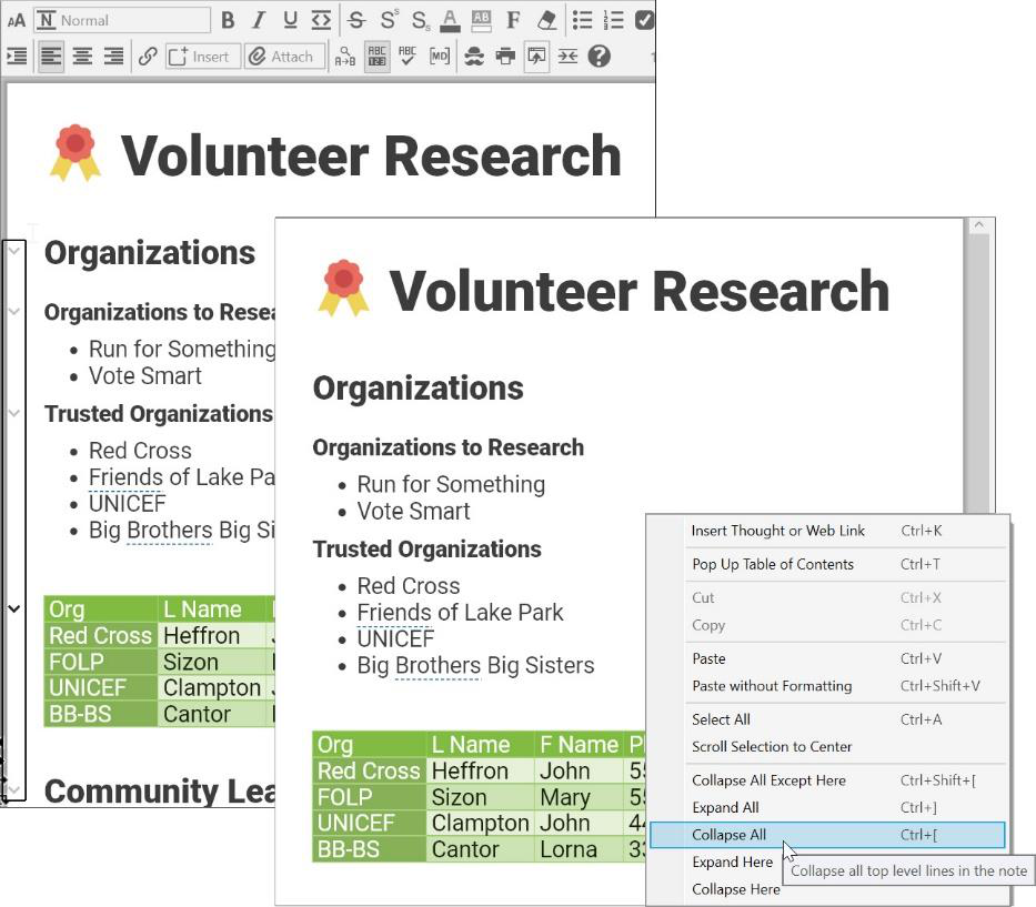 You can also collapse and expand sections within note text in a similar way when Heading styles are used.