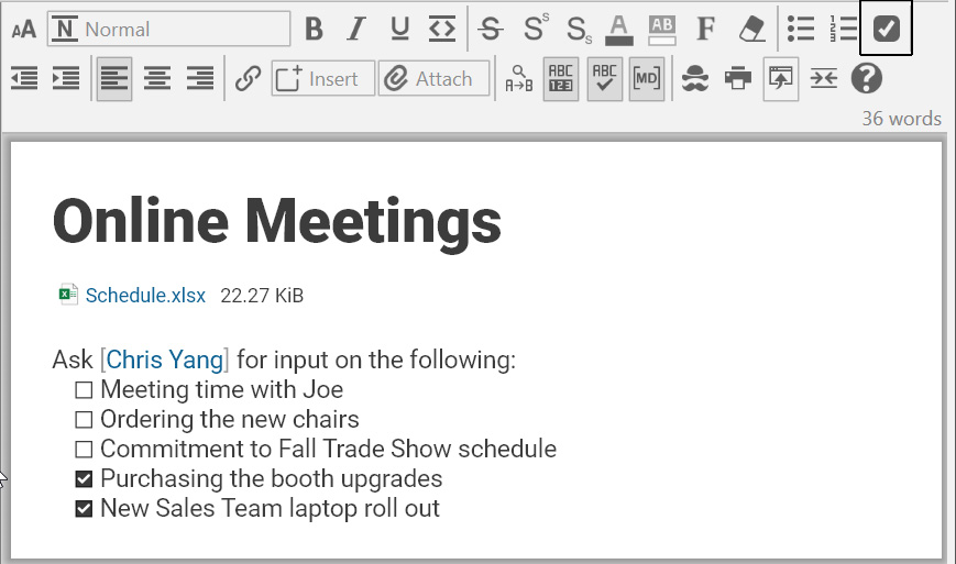 o â[ ] â (or â- â) to create a checkbox â â+ â for a pre-checked checkbox