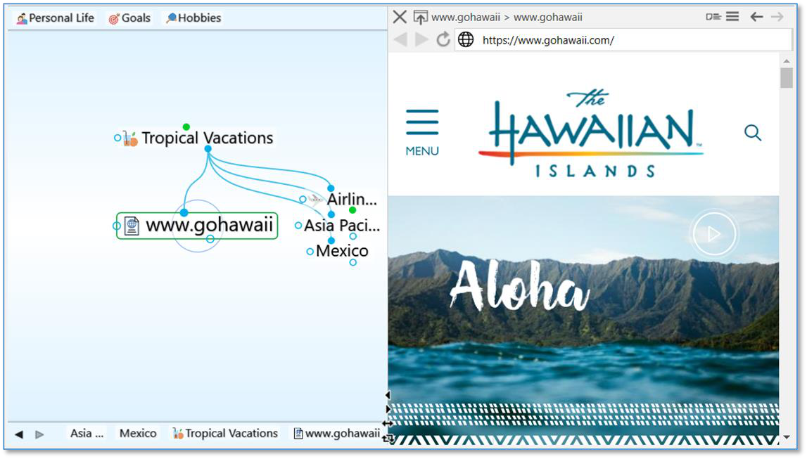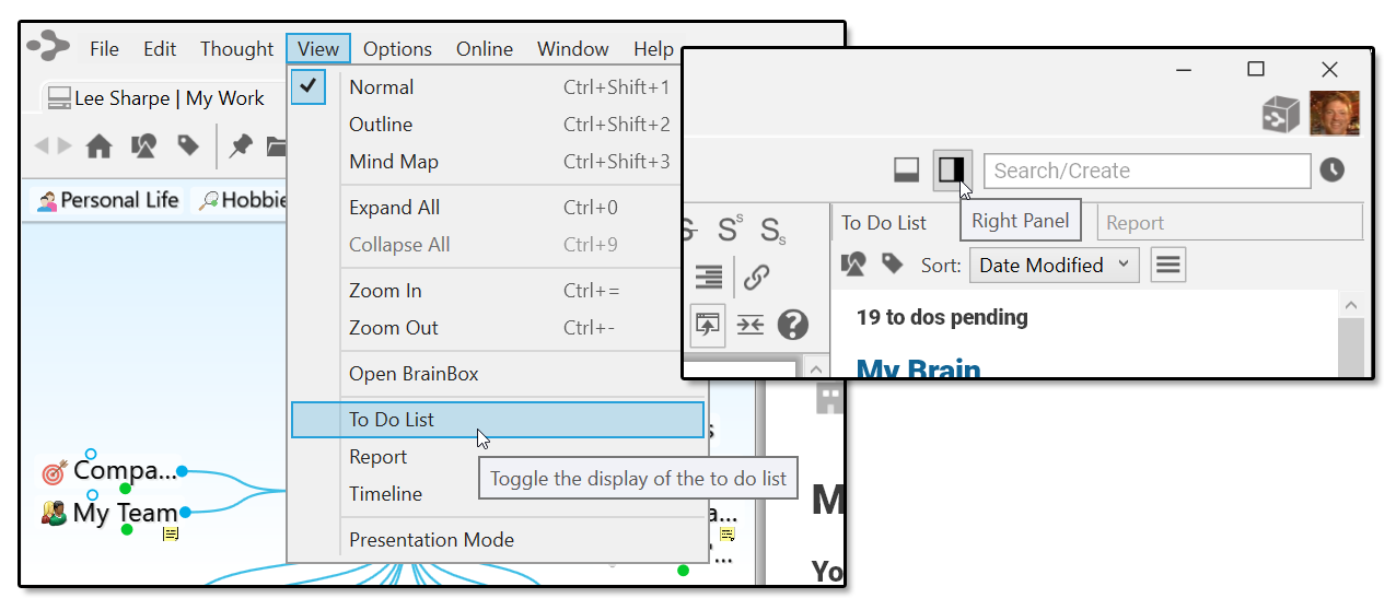 menu. Then, maximize the plex in one window and the content area in the other. Changes you make in one window will be reflected in the other because youâre working with the same brain, however, the windows wonât be in synch. In other words, making a thought active in one window wonât make it active in the other.