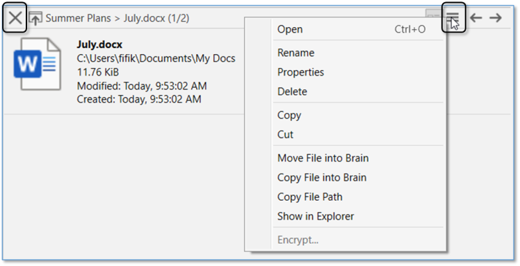 Existing attachments within a brain can be cut or copied onto your clipboard. You can then paste to a new thought in the same brain, a different brain, or to a different directory/location on your system. Right click on an attachment, or use the arrow keys to navigate the cursor up to a selected attachment while editing a note
