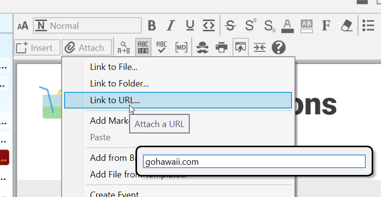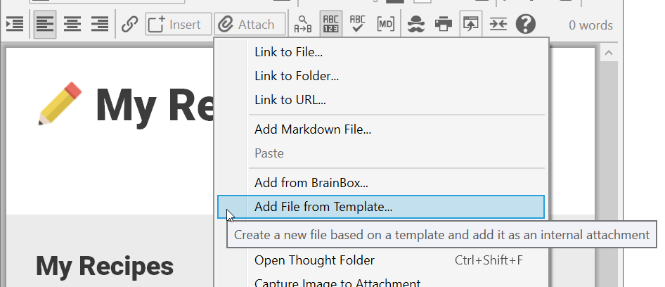 Attach: Link to File/Folder/URL, Add Markdown File, Paste, Add from Brainbox, Add File from Template, Create Event, Open Thought Folder, Capture Image to Attachment, Copy Path to Thoughtâs Folder, Template Help