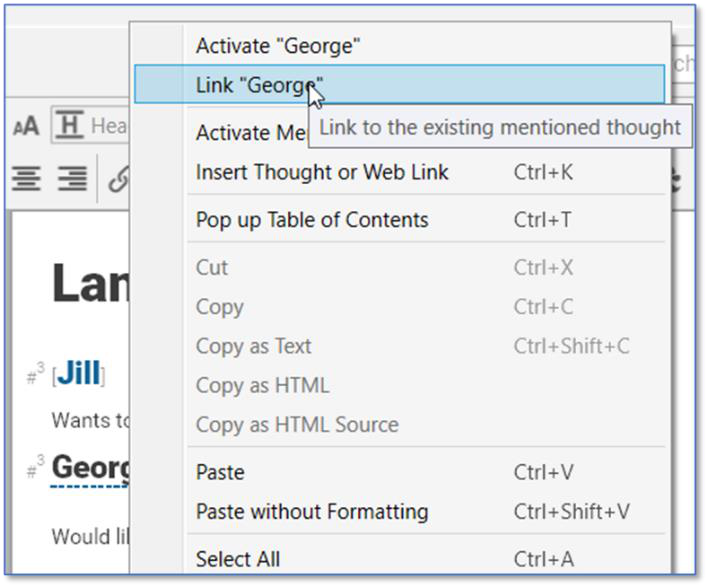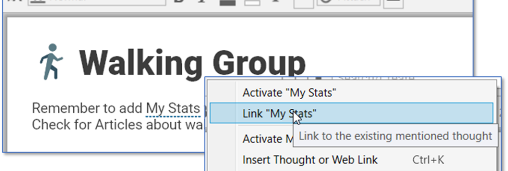 Right-click on a Mention in a note to either link to or activate this thought.