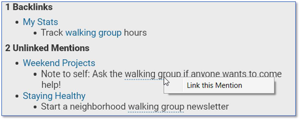 Unlinked Mentions: Thoughts whose notes contain the name of the active thoughtâŻeven if not explicitly linked