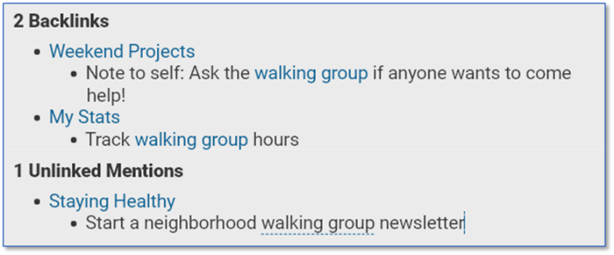 While mapped links refer to thought names, backlinks and mentions display both the names of the related thoughts and the context of the notes in which they appear.
