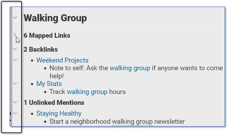 Below the note are options for displaying more related content within the same brain by opening Mapped Links, Backlinks, or Unlinked Mentions in a footer that can appear below the note: