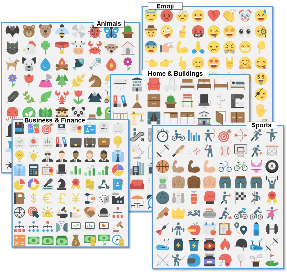 TheBrain includes nearly 2000 built-in icons for your thoughts, Types, and Tags. Choose from 22 different categories such as Animals, Emojis, Food, Multimedia, and Technology, to name a few. Here are some examples: